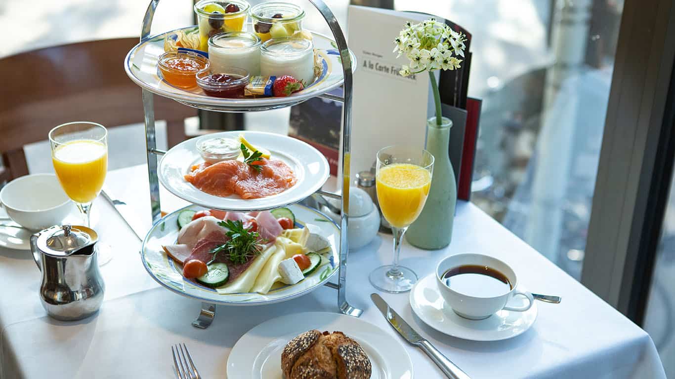 Dazu gehören diverse Aufschnitt- und Käseauswahl, Räucherlachs mit Meerrettich, zweierlei Marmeladen, Butter, gekochtes Ei, Bircher Müsli und Joghurt mit Honig, frischer Obstsalat und Brotkorbauswahl mit Croissant, dazu ein Glas frischer Orangensaft, je ein Heißgetränk Ihrer Wahl und je ein Glas Prosecco.