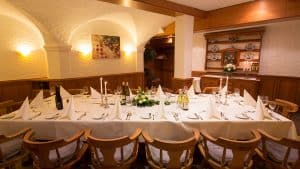 Der separate Clubraum im Restaurant Brunnenhof bietet Platz für bis zu 25 Personen und lässt sich exklusiv mieten. Der kleine, gemütlich-rustikale Saal ist mit kostbaren Kirschholz- Kassetten vertäfelt, was ihm seinen charakteristisch warmen rotbraunen Ton verleiht. Ob Geburtstagsfeiern, Jubiläen, private oder geschäftliche Anlässe oder andere Festivitäten im kleineren Kreis – das Kirschzimmer passt zu einer Vielzahl von schönen Möglichkeiten.