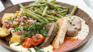 Namenspate des Lokals ist der bis heute erhaltene Brunnen im Innenhof, in dem Fische ihre Runden ziehen. Als ein sichtbares Zeichen für den Genuss, um den es im Brunnenhof schon immer ging, ließ Wilhelm Rüter die Küche offen, mit freiem Blick auf das Wirken an den Töpfen und Herden. Wer dem Treiben heute zuschaut, bekommt Appetit auf die frisch zubereiteten Klassiker und Köstlichkeiten aus den deutschsprachigen Kochstuben wie Wiener Schnitzel, Forelle Müllerin, Zwiebelrostbraten oder Omas Rinderrouladen, geschmort in Burgundersoße mit Bohnenbündchen und Petersilienkartoffeln – Heimatfood at it’s best!