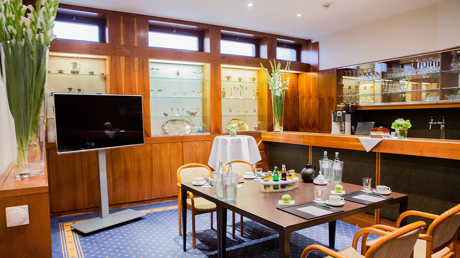Salon 1 entspricht einem Chambre Séparée mit seiner stilvollen Bar, an der bis zu fünf Personen Platz haben. In direkter Kombination mit den Salons 2 + 3 + 4 ist er eine wunderbare Ergänzung für größere Firmentagungen, Presse-Gespräche oder Vorstandssitzung und ein Eckchen, wo man zusammensteht und redet.